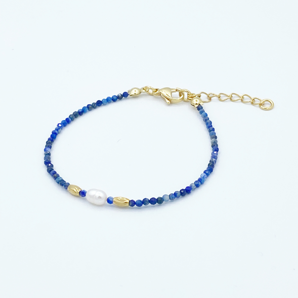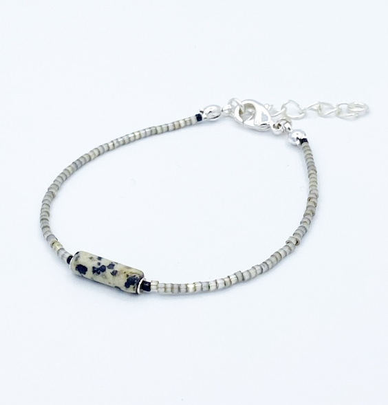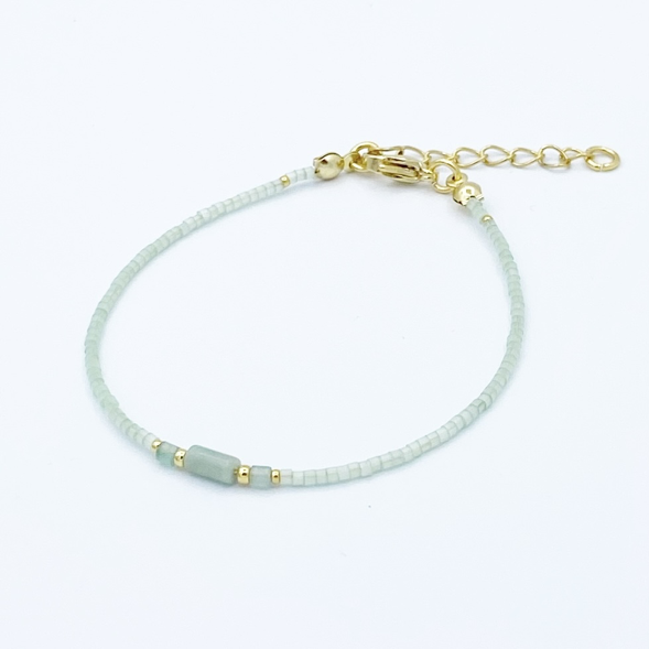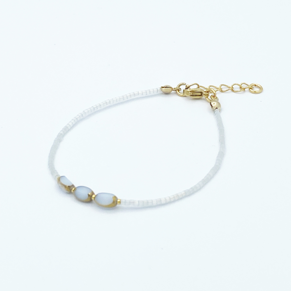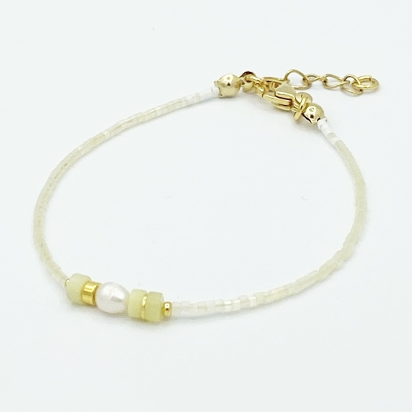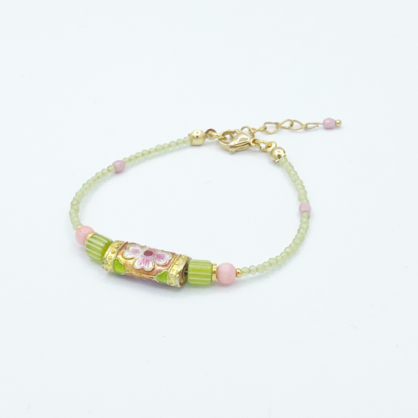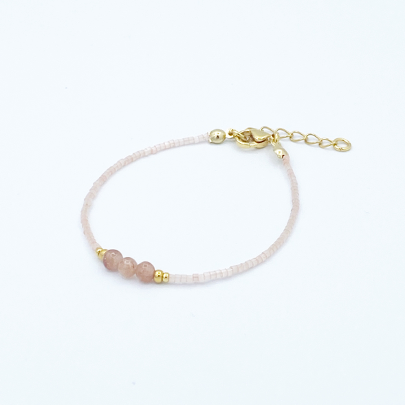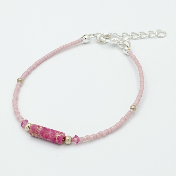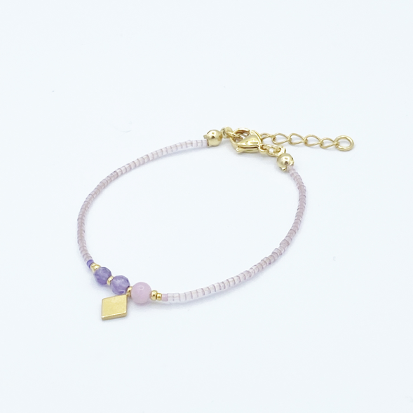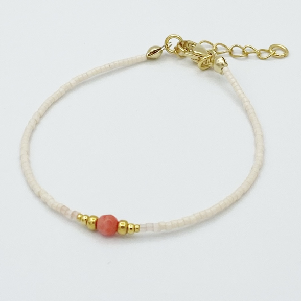 Fijne armband met roze kraaltjes en in het midden ook nog iets. Ik vind hem leuk, jij ook?